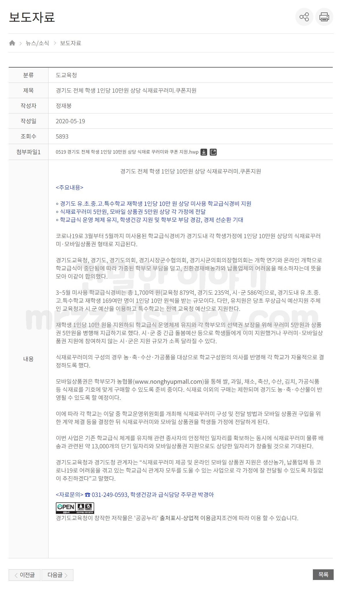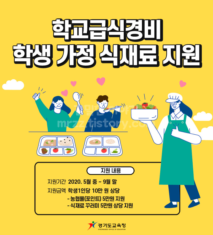- 지원 2: 학교 자율 품목 구성 5만원 상당 “식재료 꾸러미” 학생 가정 내 지원